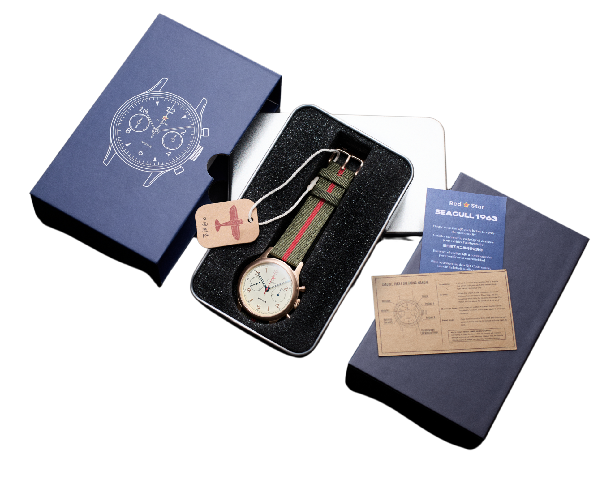 In der Blechdose erwartet Sie die Seagull 1963 Chronographen-Uhr, geschmückt mit ihrem charakteristischen grünen 2-teiligen Armband. Begleitend zu Ihrem Zeitmesser finden Sie ein spezielles Tag, eine Garantiekarte und ein Handbuch, das Ihnen Einblicke in die Bedienung der ST1901 Chronographenfunktionen und das Aufziehen des ST19 Uhrwerks gibt.