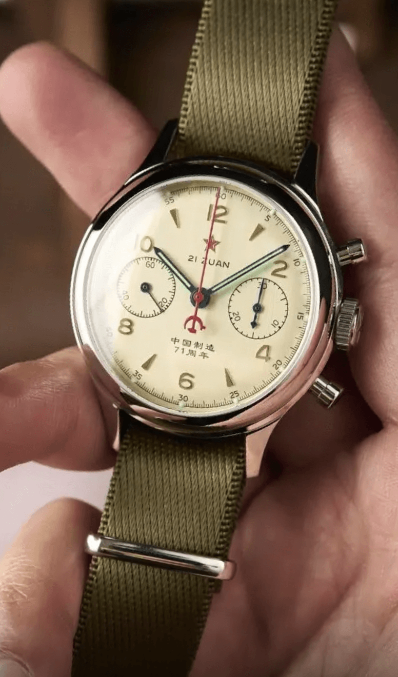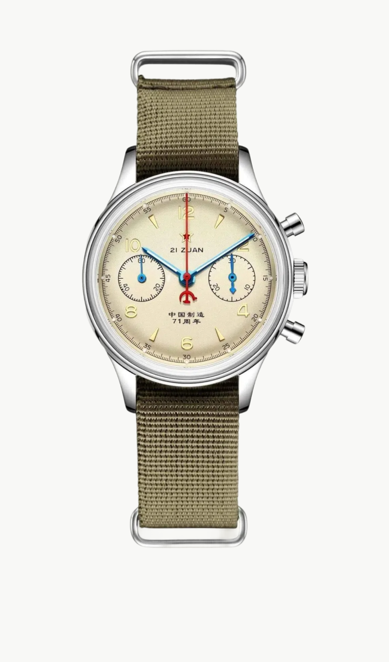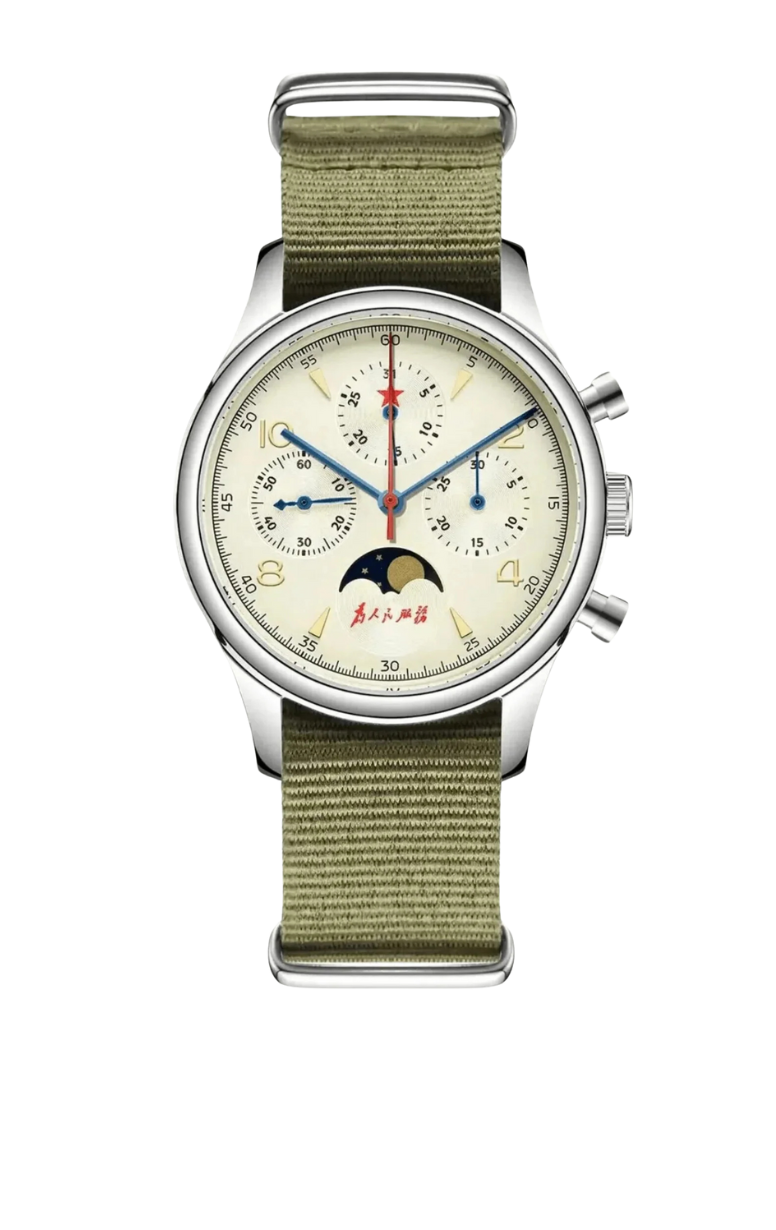 Questo epico orologio omaggio riflette il design dei primi orologi cinesi prodotti nel 1955. Questo orologio omaggio riflette lo stile vintage degli antichi orologi cinesi. Il vetro minerale, il cinturino retrò in acciaio a molla, il quadrante color panna o champagne e la simbolica stella rossa ricordano tutti il design del classico originale. Questo orologio omaggio è un must per gli amanti degli orologi vintage. Si trova nello stesso settore del Seagull 1963 e puoi trovare maggiori informazioni sul Red Army Wuxing nel nostro sito web!