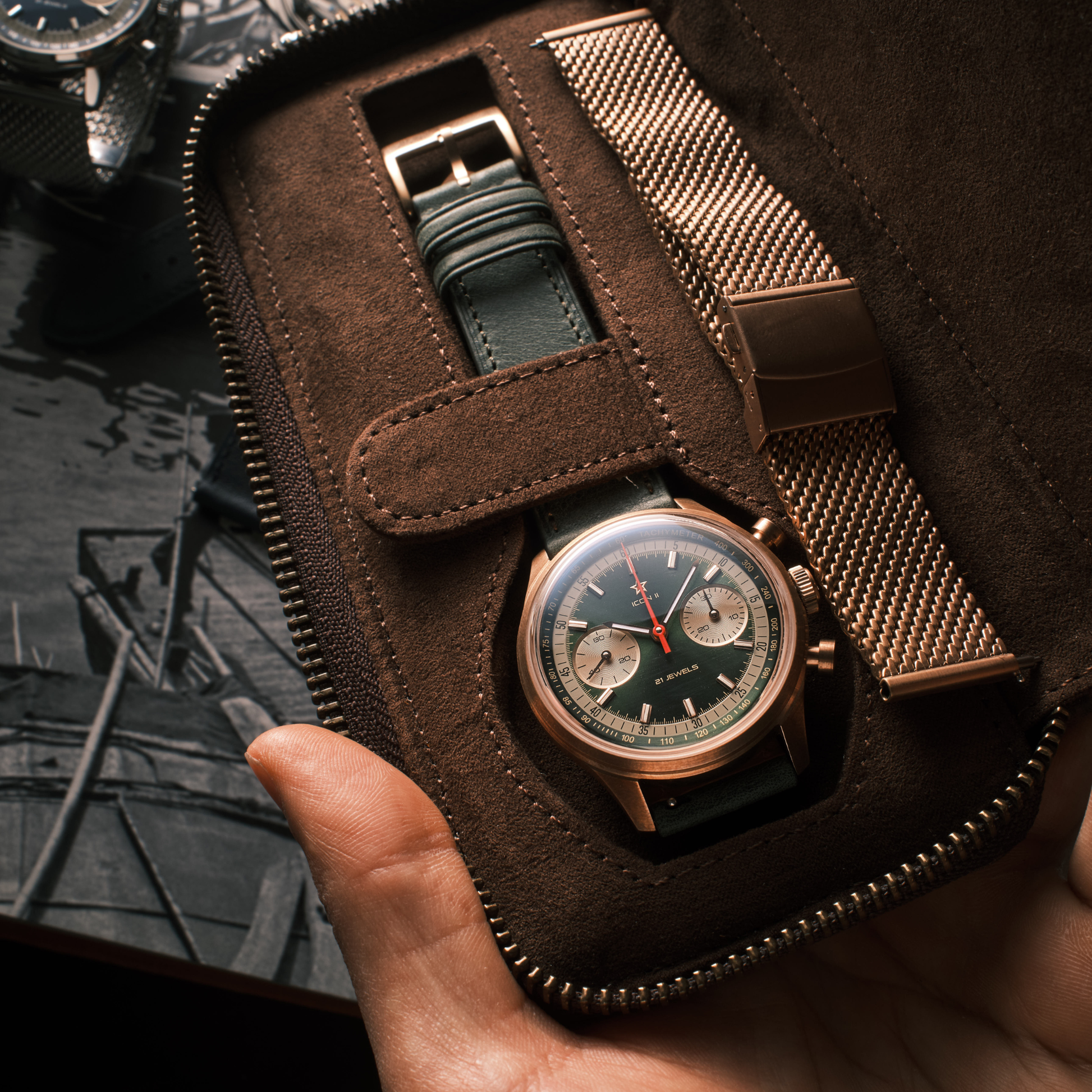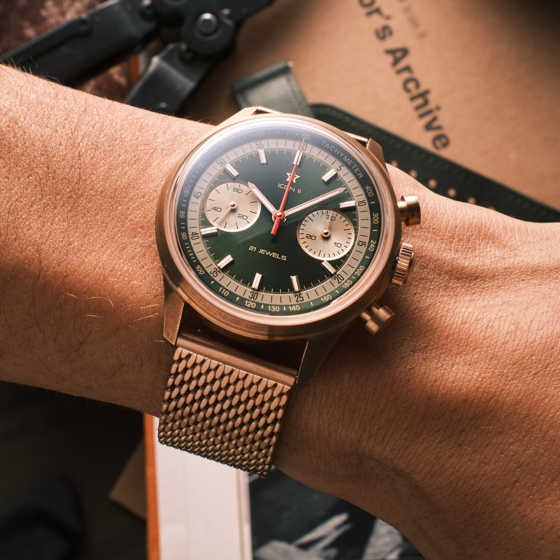 Its sunburst dial shifts from emerald to deep forest green, framed by the warm, brushed finish of CuSn8 bronze. Unlike steel, this is a living material; over time, the case will oxidize and develop a unique patina, becoming a personal map of your own journey.